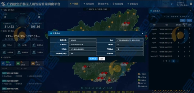 平台对接广西“智慧林火”卫星监测系统,支持自动接收热点信息并就近下发核查任务,实现“卫星发现、无人机核查”的高效联动。