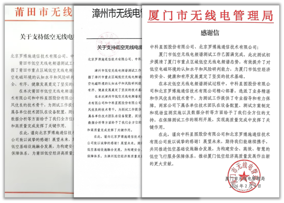 近日,厦门市、漳州市、莆田市无线电管理局先后向中科星图发来感谢信,对公司在当地低空无线电频谱测试工作中提供的专业技术支撑、全方位服务保障表示诚挚感谢,高度认可公司为当地低空经济安全有序发展奠定的坚实技术基础,同时期待未来继续携手深化合作,共推低空基础设施融合发展,构建安全、高效、智慧的低空飞行服务保障体系。