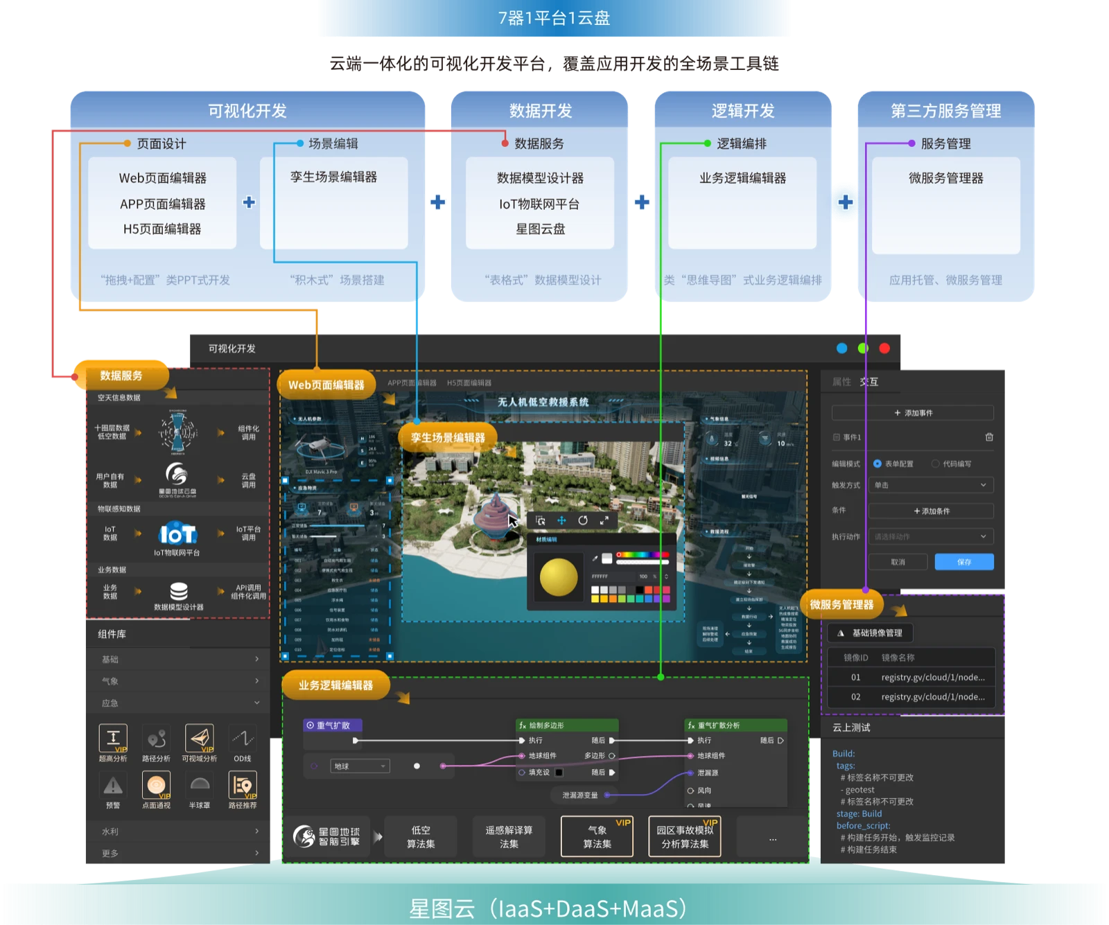 星图云开发者平台是星图云生态体系中的核心开发中枢,深度集成星图云空天信息产业链多圈层能力及数字地球引擎、数字孪生引擎、AI、IoT等全域能力,面向开发者打造统一集成、云端一体化的可视化开发平台,提供覆盖可视化开发、数据开发、逻辑开发、服务管理的全场景工具链。平台支持“拖拽+配置”的“类PPT开发”模式,无缝调用星图云上的数据、算法、应用等资源,实现从数据接入、算法调用、应用协同开发到应用发布部署的云上一站闭环,全流程降低开发门槛与成本,助力企业快速构建数字化转型能力,实现降本增效。