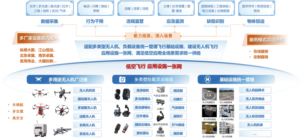 基于星图云及星图低空云提供的云上低空数据、云上低空计算、云上低空管控等能力,通过整合无人机硬件、管理调度软件、飞行与图像算法,围绕着场景化、运营化、开放化的产品设计思路,构建“1网、6中心、N标准、M场景”的飞行应用平台,实现调度、管控、应用、运营的体系化、自动化、智能化,满足政、企、民全类用户的低空业务需求。